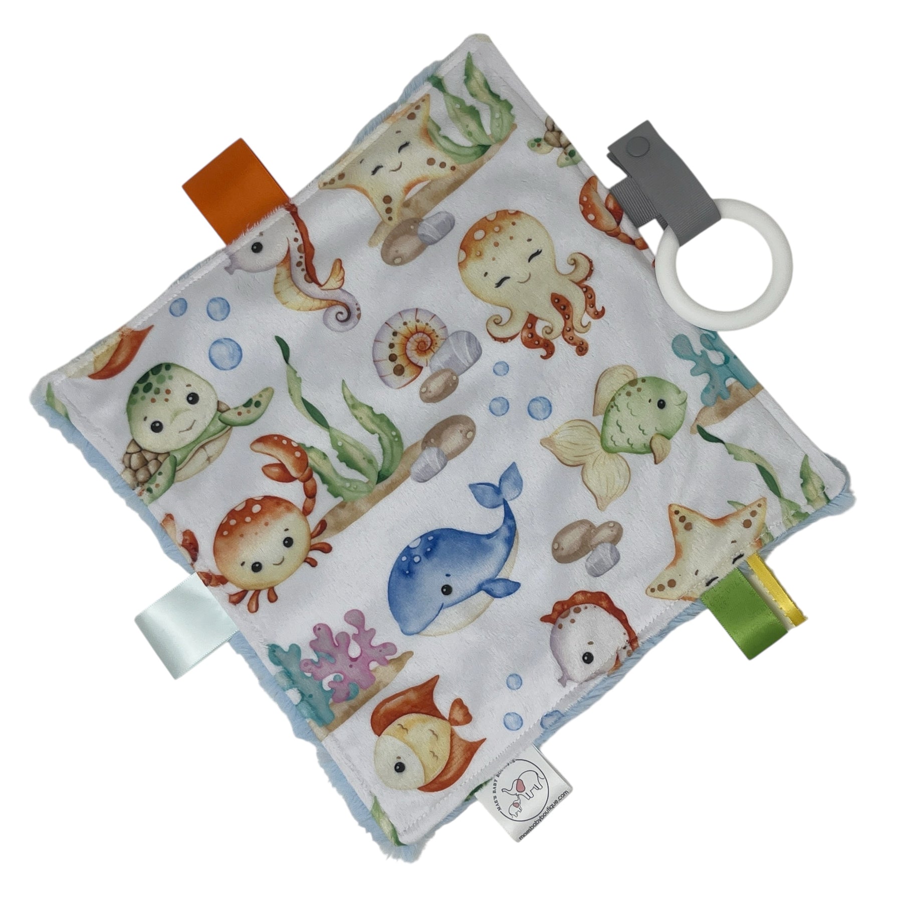 Calm your little one with this cuddly soft teething blanket. Comes with teething ring and sensory ribbons to keep your little ones busy. Soft minky fabric with snuggle fur minky backing. Teething ring is designed to be removable for easy cleaning and allow for pacifiers or toys to be added.