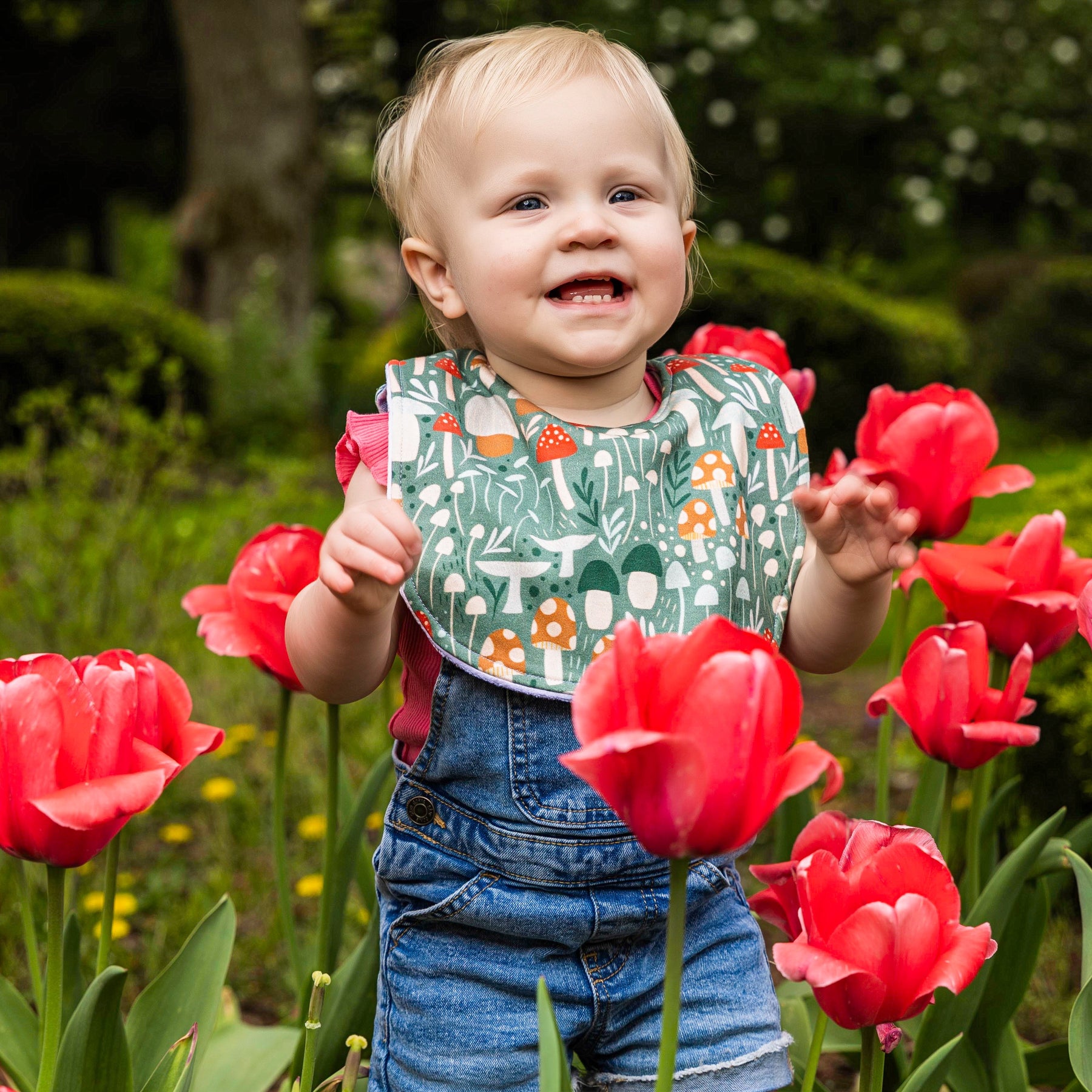 Traditional style bibs are available in a fun and trendy pattern of mushrooms and toadstools and just the right size to keep your little one clean from bottle feedings to toddler years! Made from the softest organic cotton with a soft polyester minky backing. Multiple plastic snaps allow bib to fit from infant to toddler.