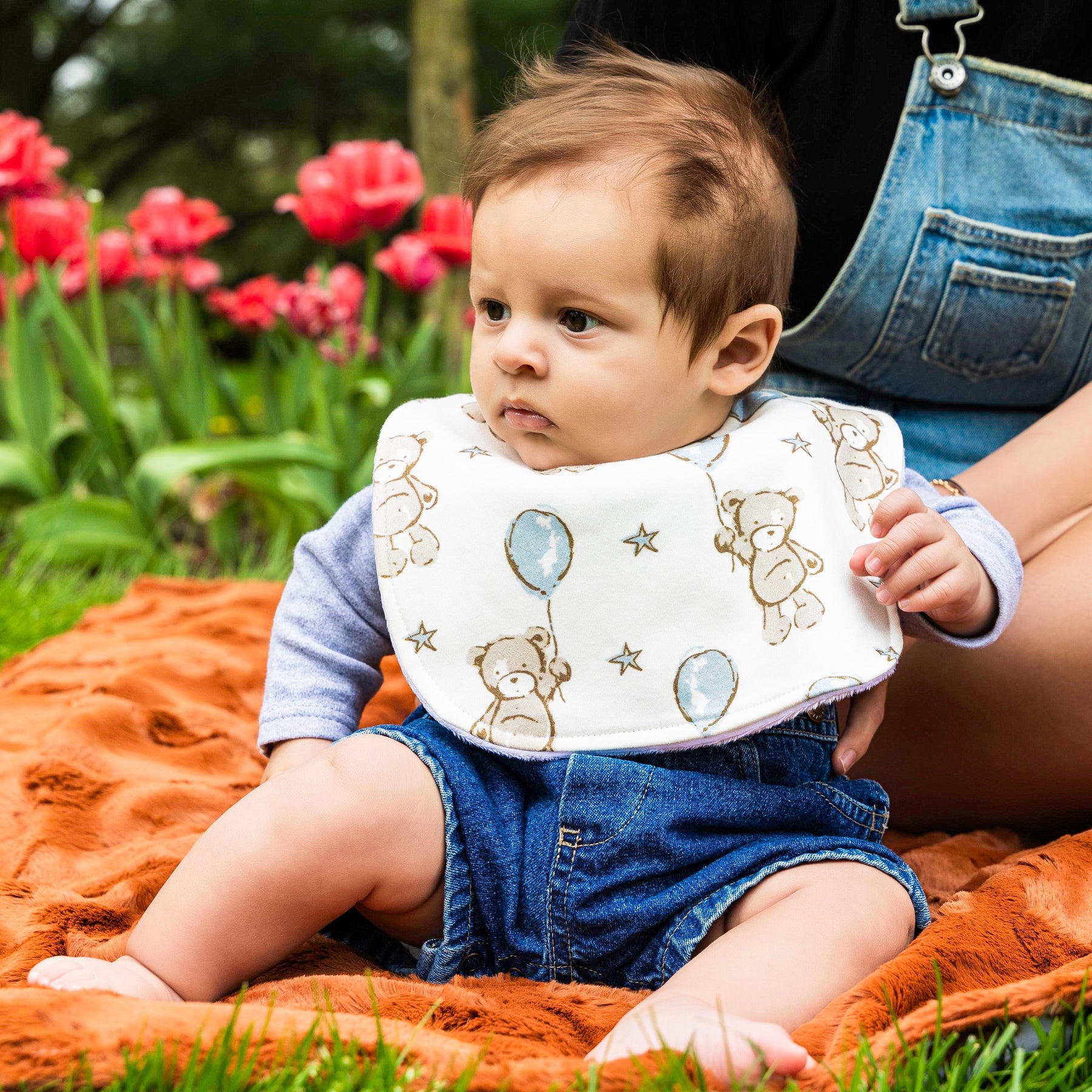 Mae’s traditional style bibs are available in fun and trendy patterns and just the right size to keep your little one clean from bottle feedings to toddlers learning to master the art of utensils!  Made from the softest organic cotton with a soft polyester minky backing.  Three plastic snaps allow bib to fit from infant to toddler.